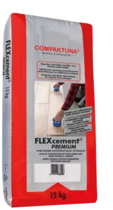 FLEXcement® PREMIUM is een droge samenstelling die door eenvoudige toevoeging van water een gebruiksklare licht verwerkbare lijm geeft met zeer grote €œflexibiliteit€.