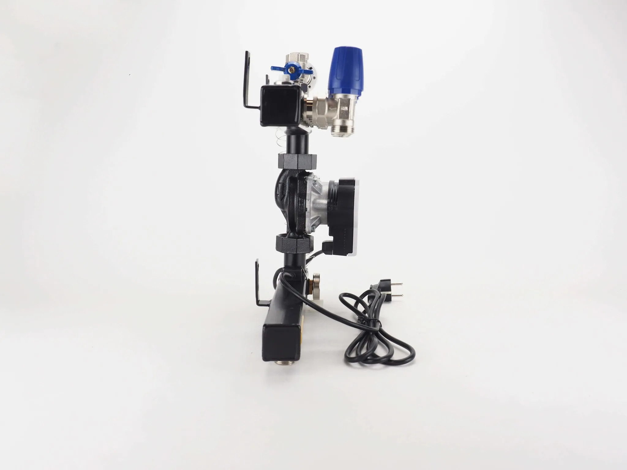 De stalen LTV-verdeler bestaat uit een voorgemonteerde stalen constructie met circulatiepomp, thermometer en dubbel instelbare groepsafsluiters.