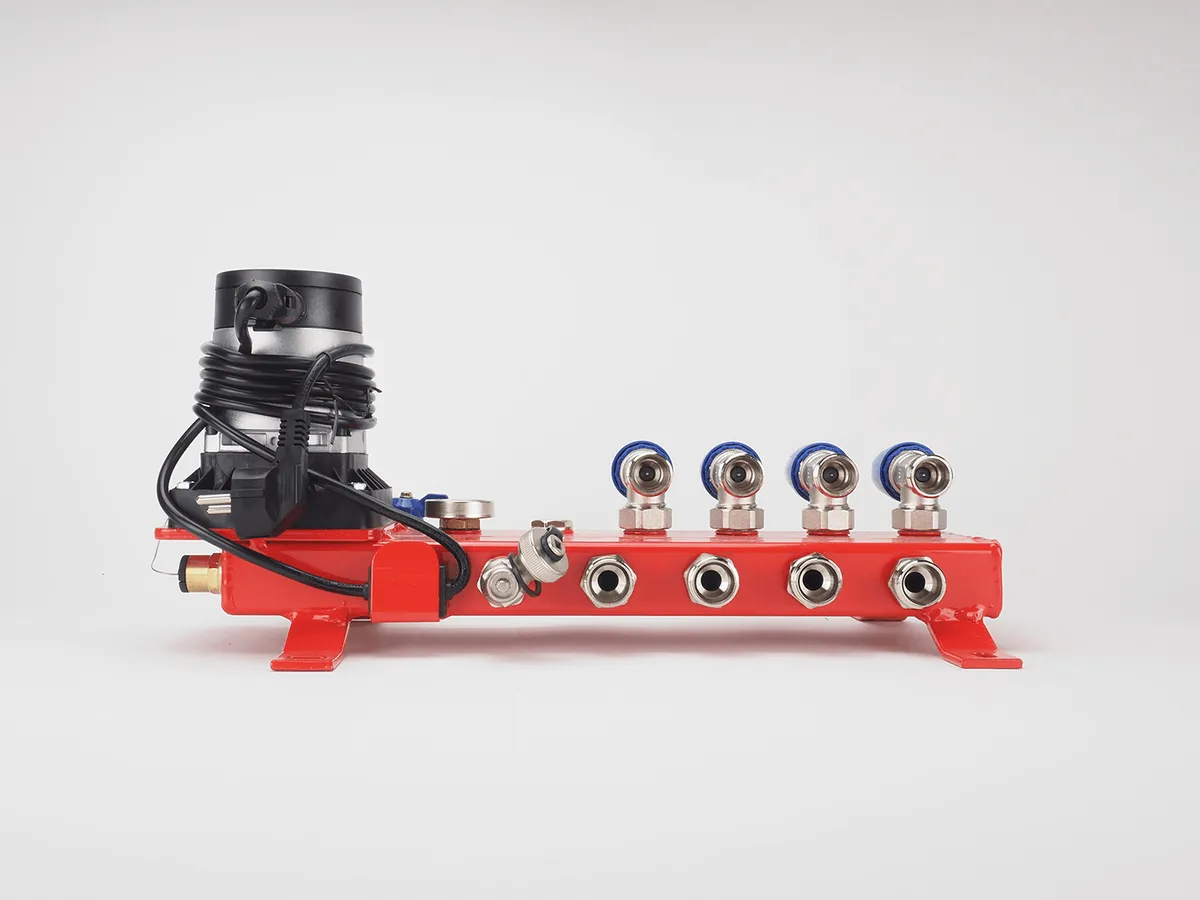 De stalen LTV-verdeler bestaat uit een voorgemonteerde stalen constructie met circulatiepomp, thermometer en dubbel instelbare groepsafsluiters.