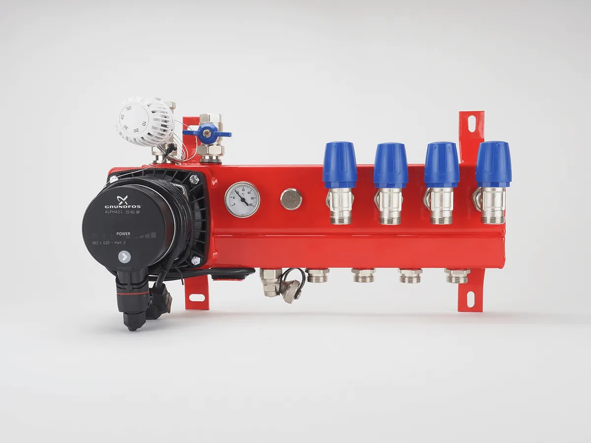 De stalen LTV-verdeler bestaat uit een voorgemonteerde stalen constructie met circulatiepomp, thermometer en dubbel instelbare groepsafsluiters.
