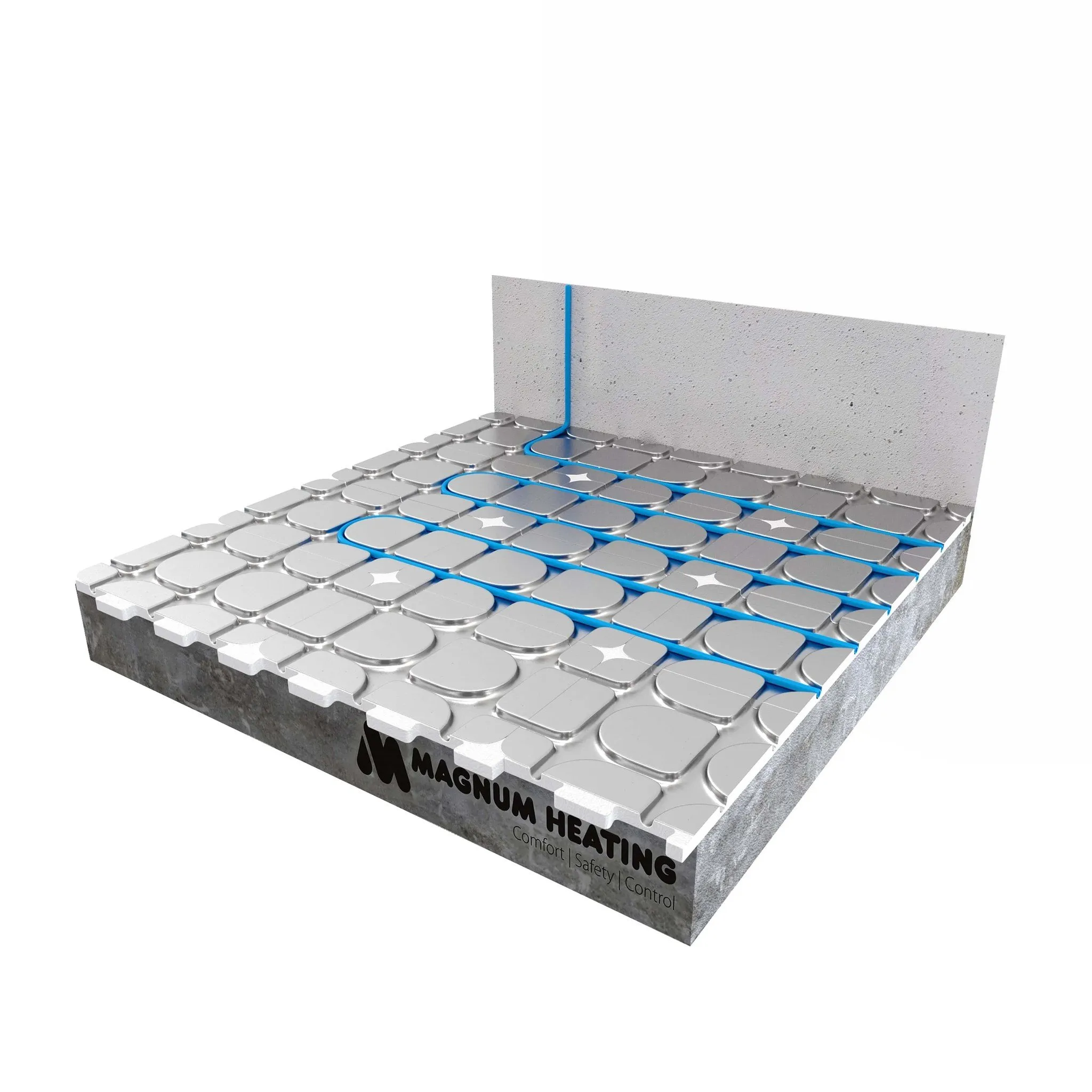 De systeemplaten kunnen als puzzelstukken aan elkaar worden gelegd. Ze zijn tevens eenvoudig op maat te snijden met een hobbymes. Hierna kan de 12mm MAGNUM Tube vloerverwarmingsbuis er eenvoudig worden ingeklemd. De vaste buisafstand hierbij is 12,5cm. Per 1m2 is ongeveer 8m1 (strekkende meter) MAGNUM Tube nodig. De vloer kan daarna worden afgedekt met de meegeleverde viltlaag waarop de topvloer kan worden aangebracht.