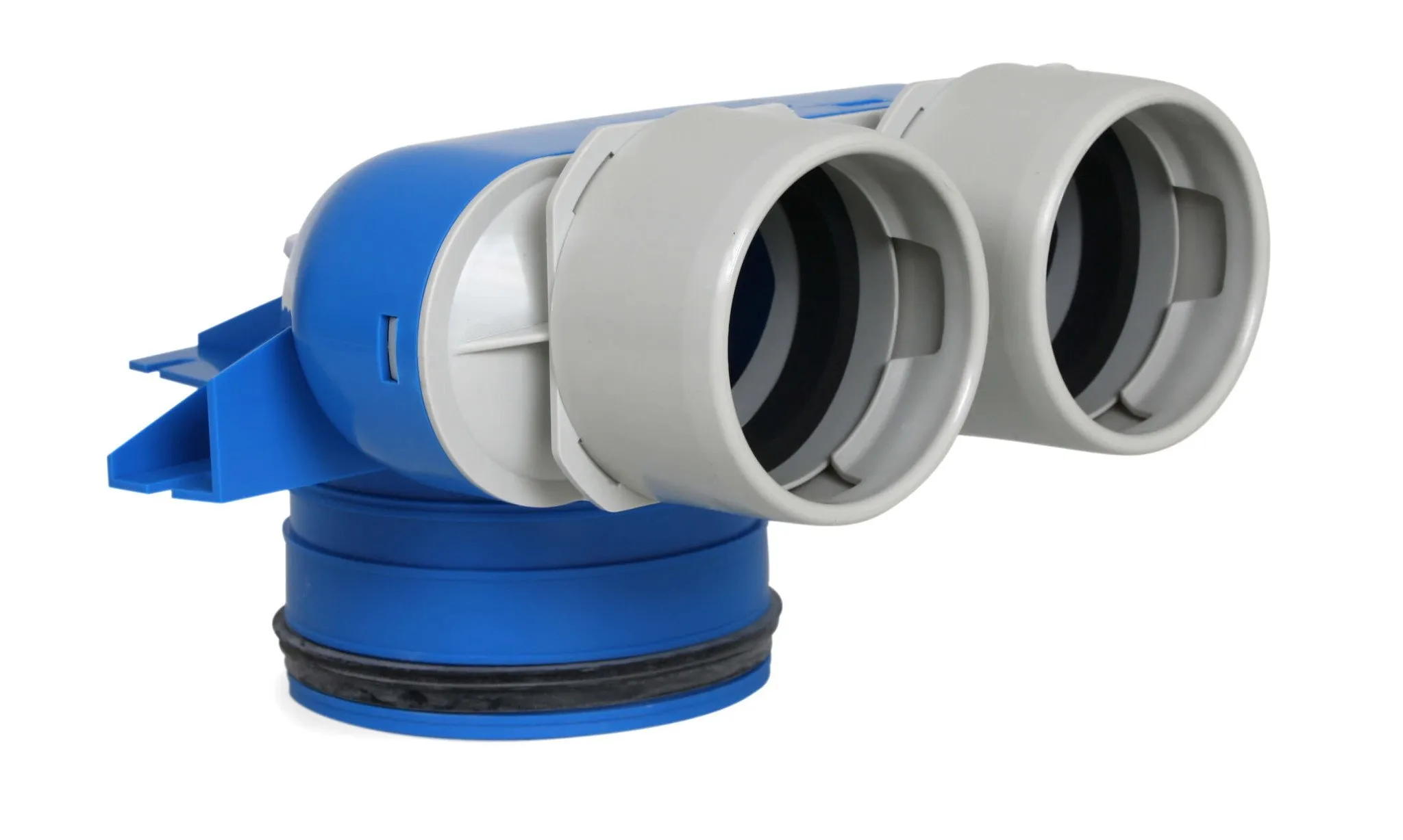 2x Ø75mm ventilatieslang aansluiting. geschikt voor ieder type rond ventilatieventiel Ø125mm met klemveren. Geschikt voor verticale aansluiting.