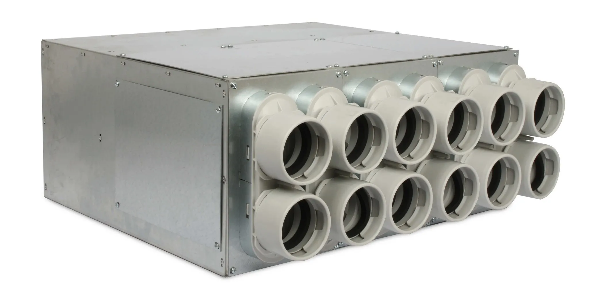 Deze verdeler geeft de mogelijkheid om 12 ventilatie slangen aan te sluiten met een Ø75mm. Daarnaast is de verdeler voorzien van een tuit van Ø125mm of Ø160mm of Ø180mm.