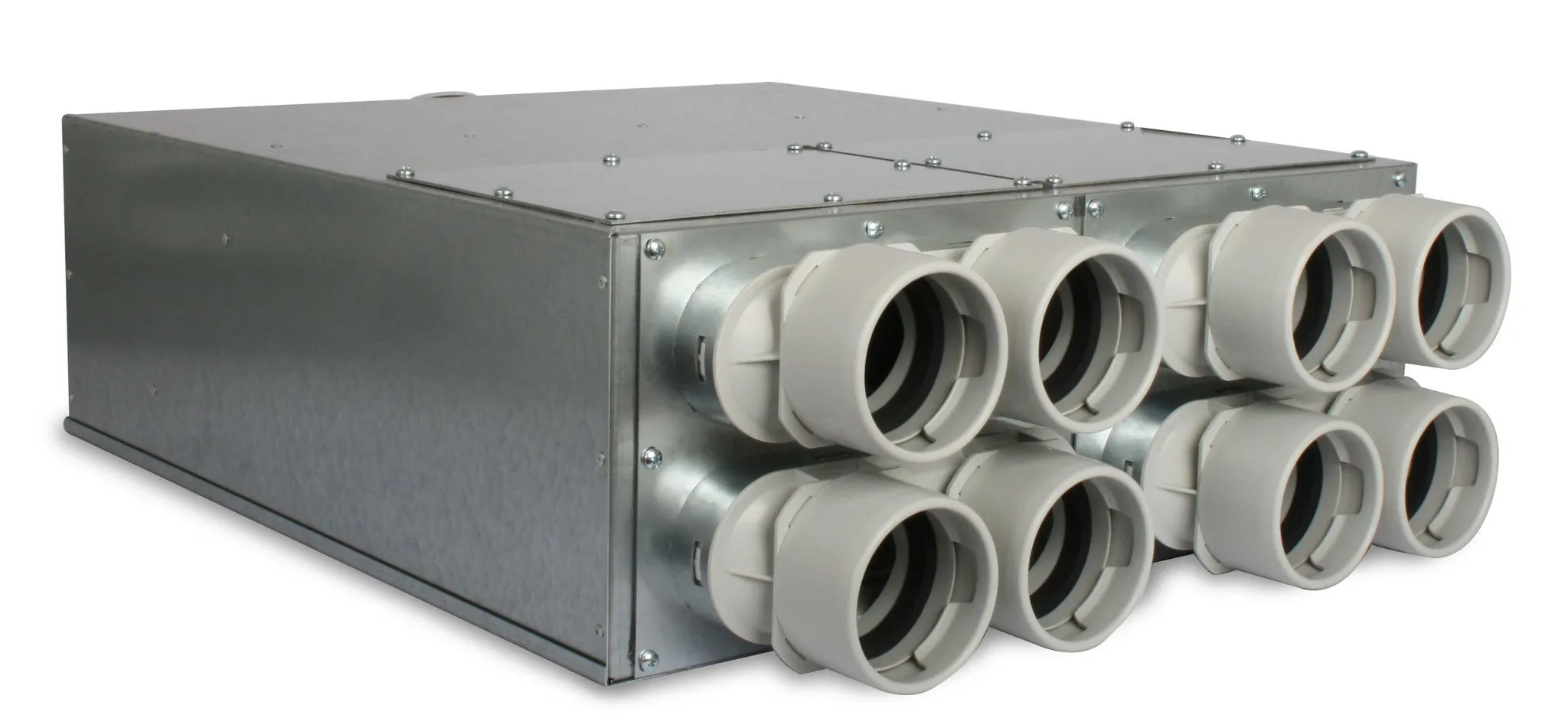 Deze verdeler geeft de mogelijkheid om 8 ventilatie slangen aan te sluiten met een Ø75mm. Daarnaast is de verdeler voorzien van een tuit van Ø125mm of Ø160mm of Ø180mm. Dit product is inclusief 8 afdichtdoppen van Ø75mm.