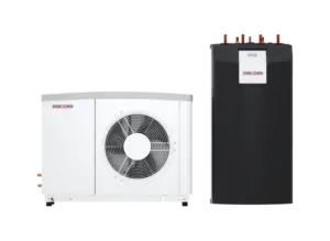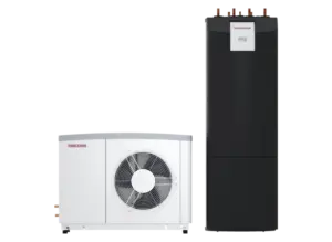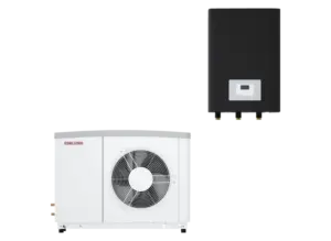 Deze set bevat een lucht-water-warmtepomp die buitenshuis is geplaatst en opmerkelijk efficiënt is dankzij geavanceerde invertertechnologie.